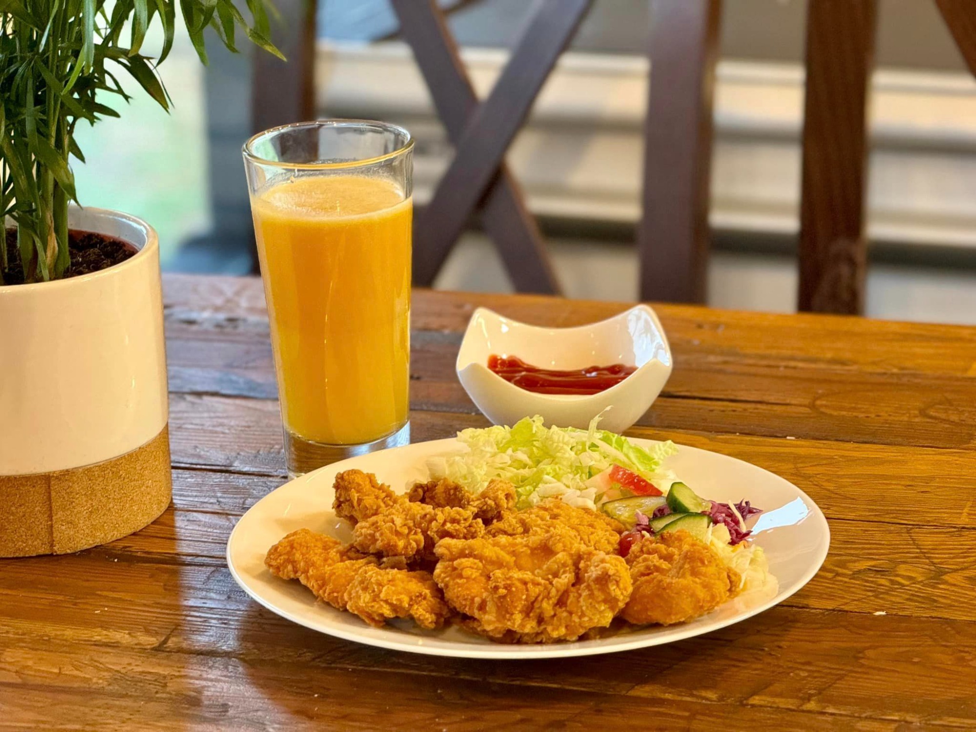 stripsy z kurczaka, frytki, surówka, ser żółty, sos do wyboru -