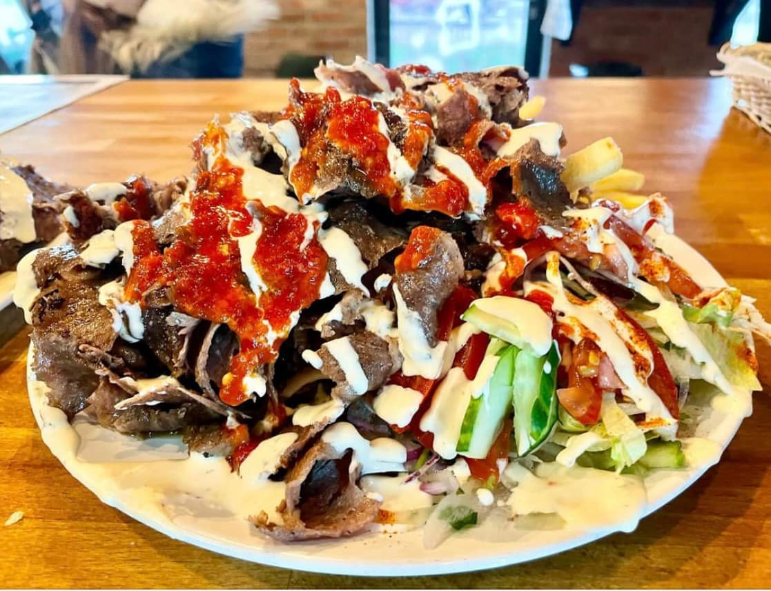 mięso, surówka, warzywa, ser feta, ser cheddar, frytki, sos do wyboru -